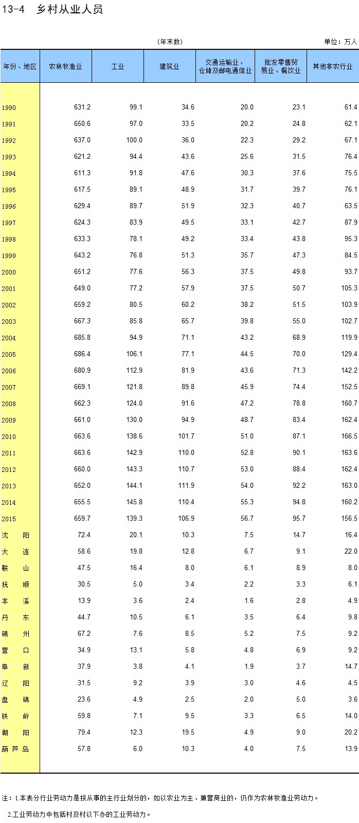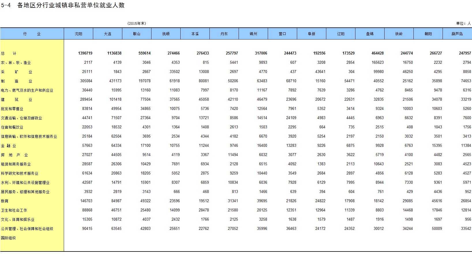 5-4 各地区分行业城镇非私营单位就业人数