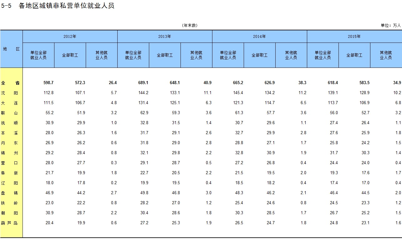 5-5 各地区城镇非私营单位就业人员