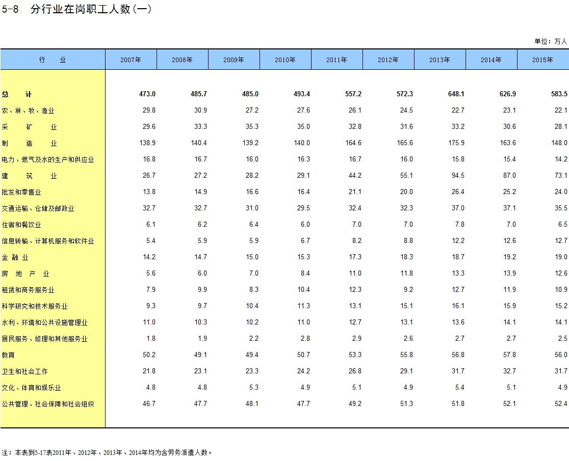 5-8 分行业在岗职工人数(一)
