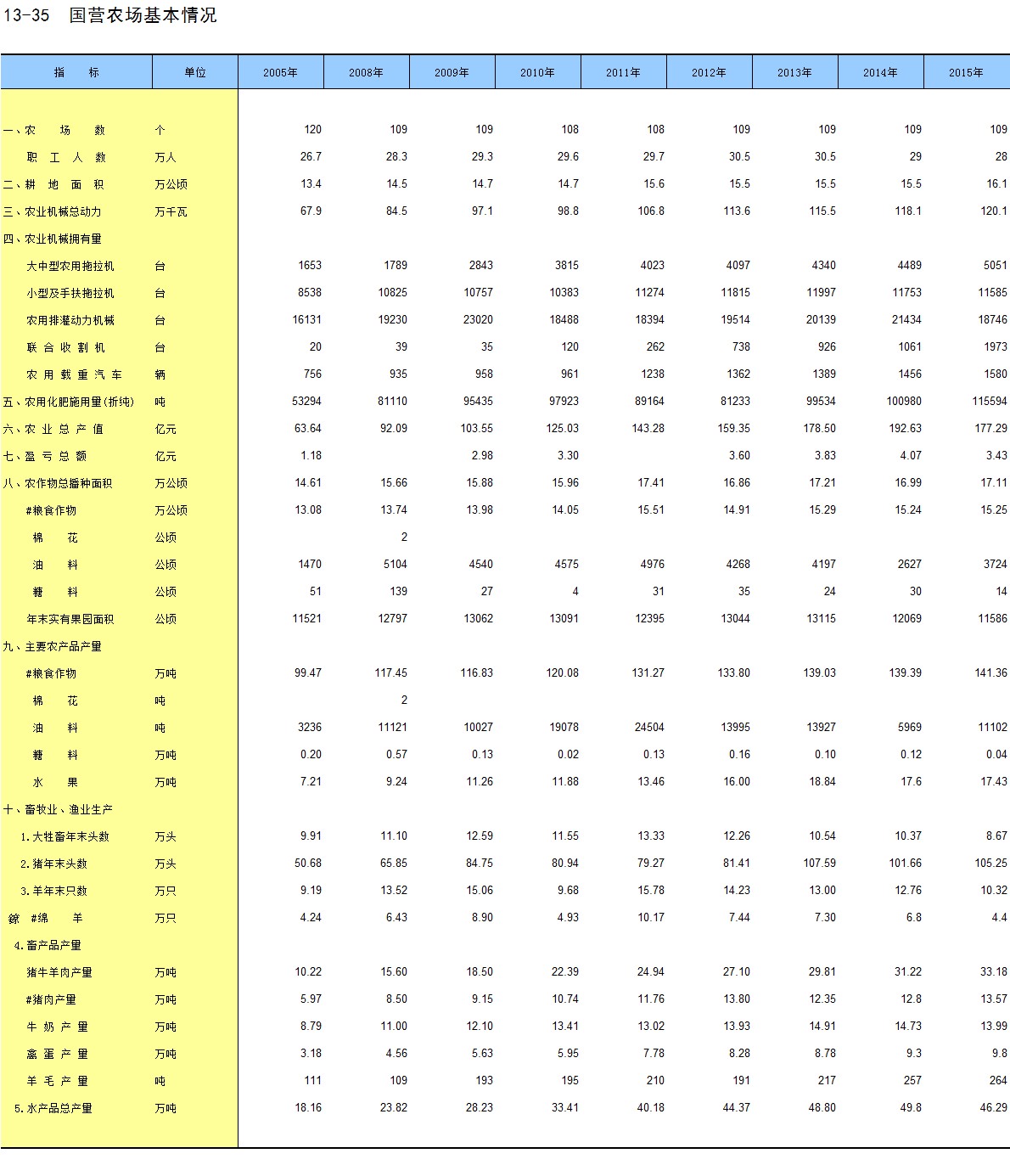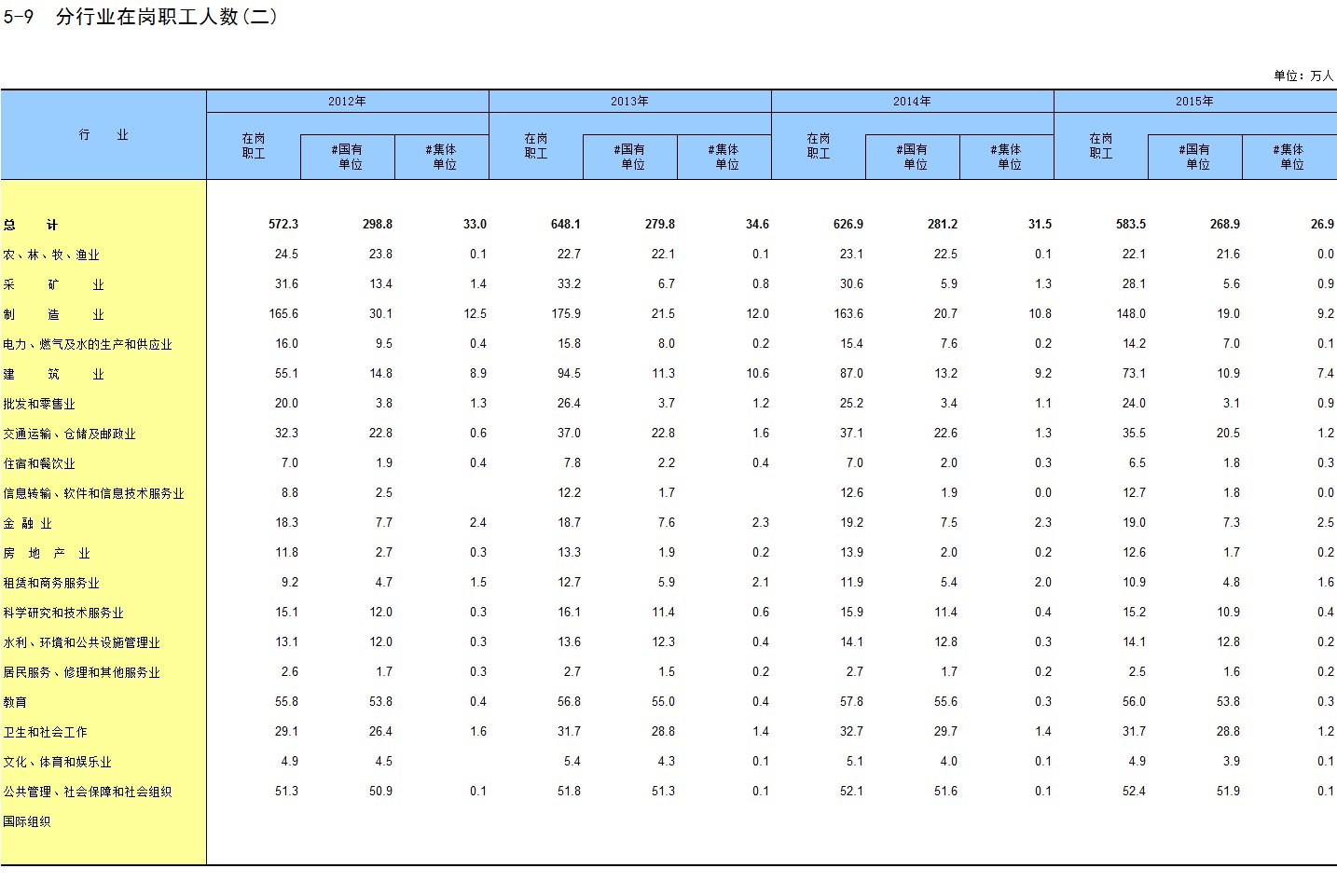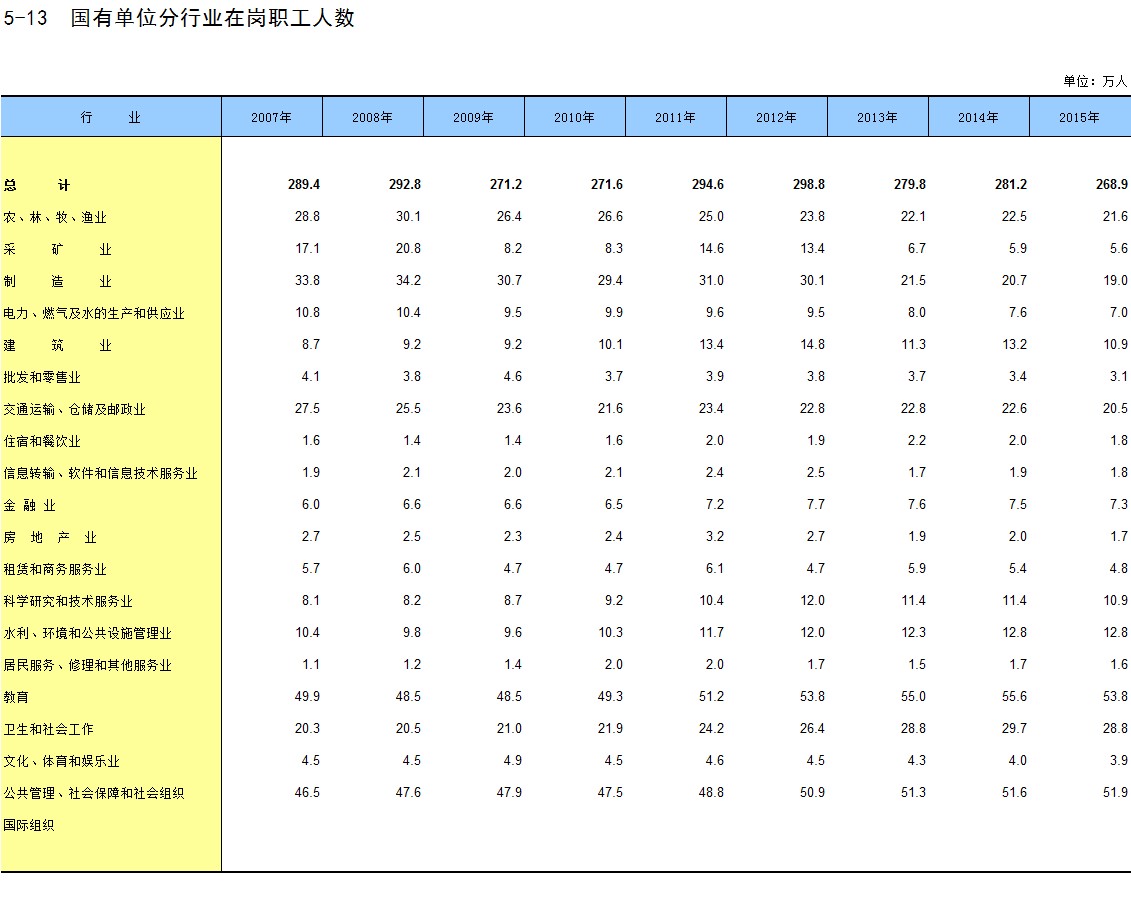 5-13 国有单位分行业在岗职工人数
