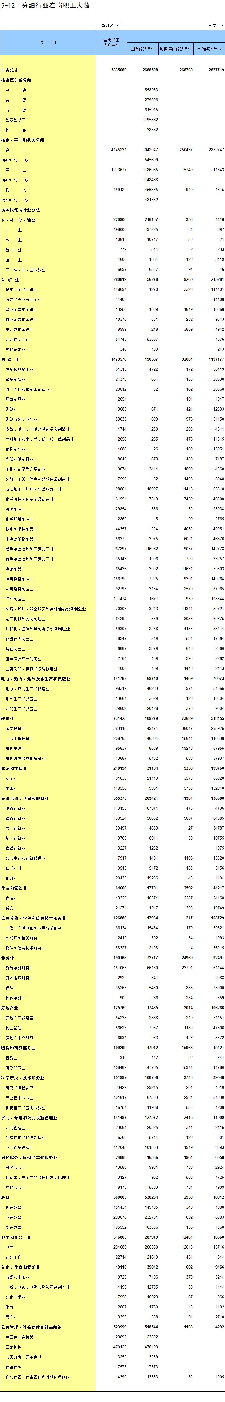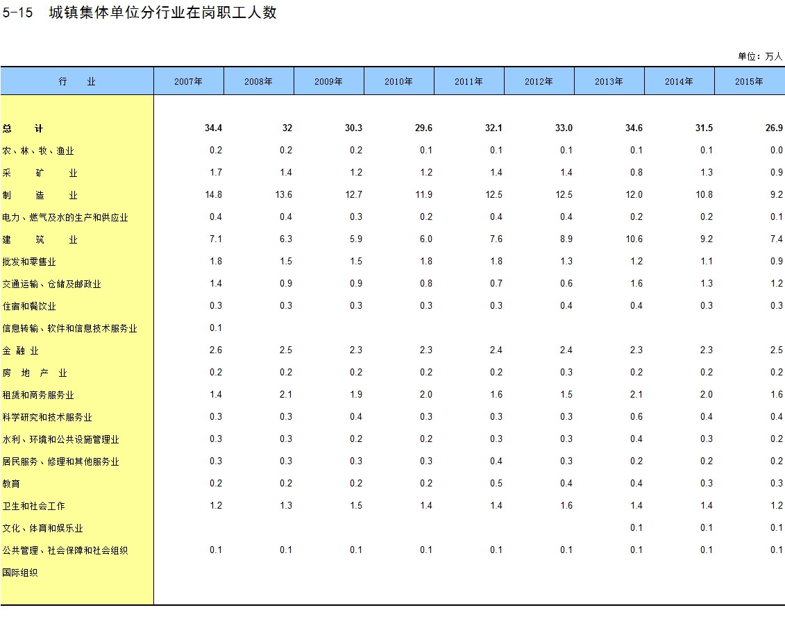 5-15 城镇集体单位分行业在岗职工人数