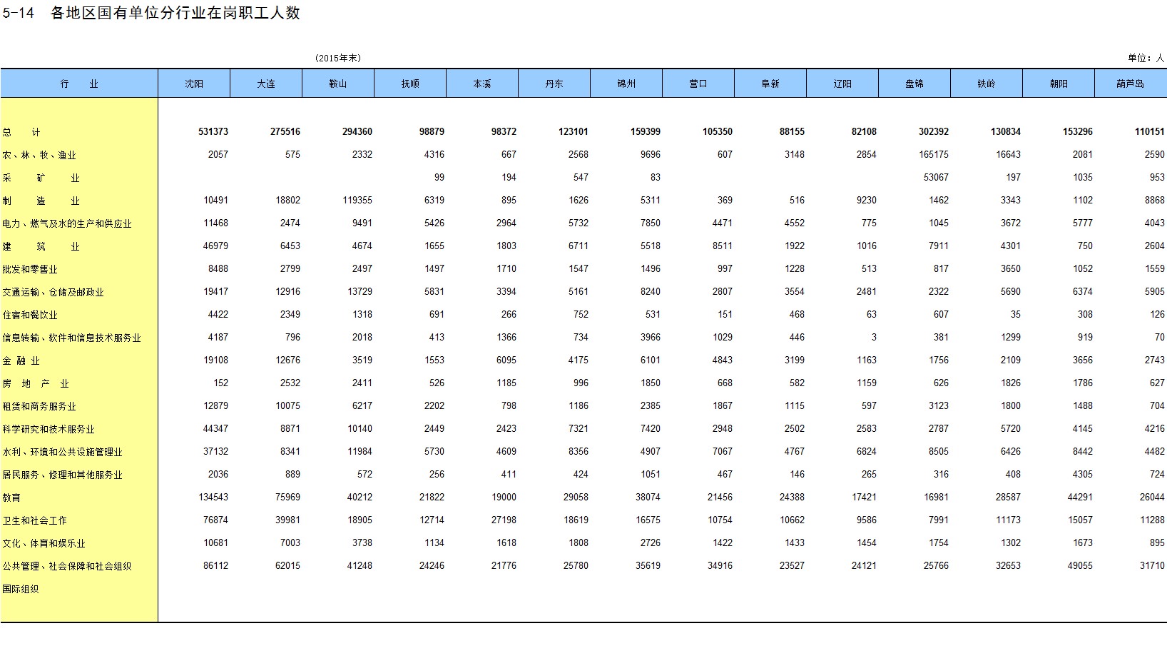 5-14 各地区国有单位分行业在岗职工人数