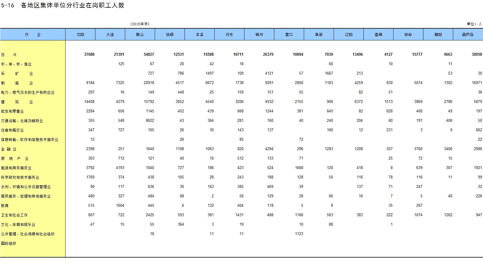 5-16 各地区集体单位分行业在岗职工人数