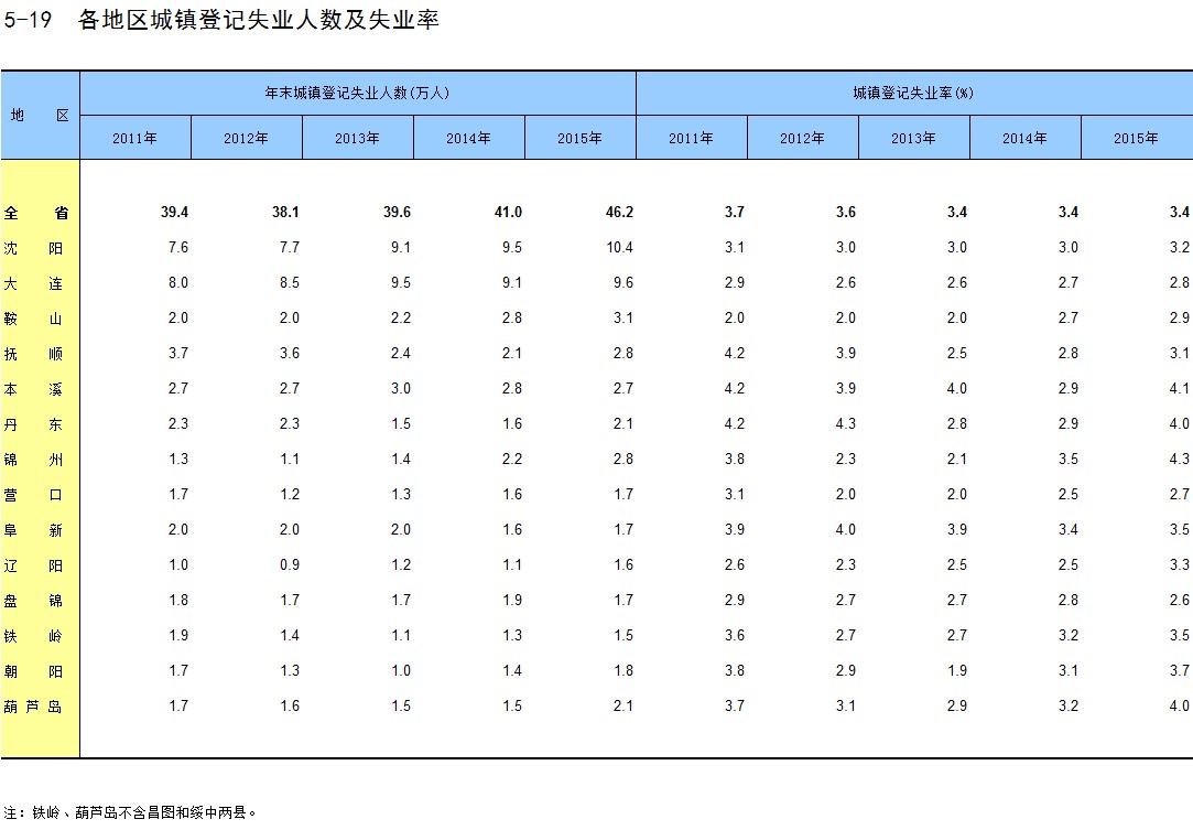 5-19 各地区城镇登记失业人数及失业率