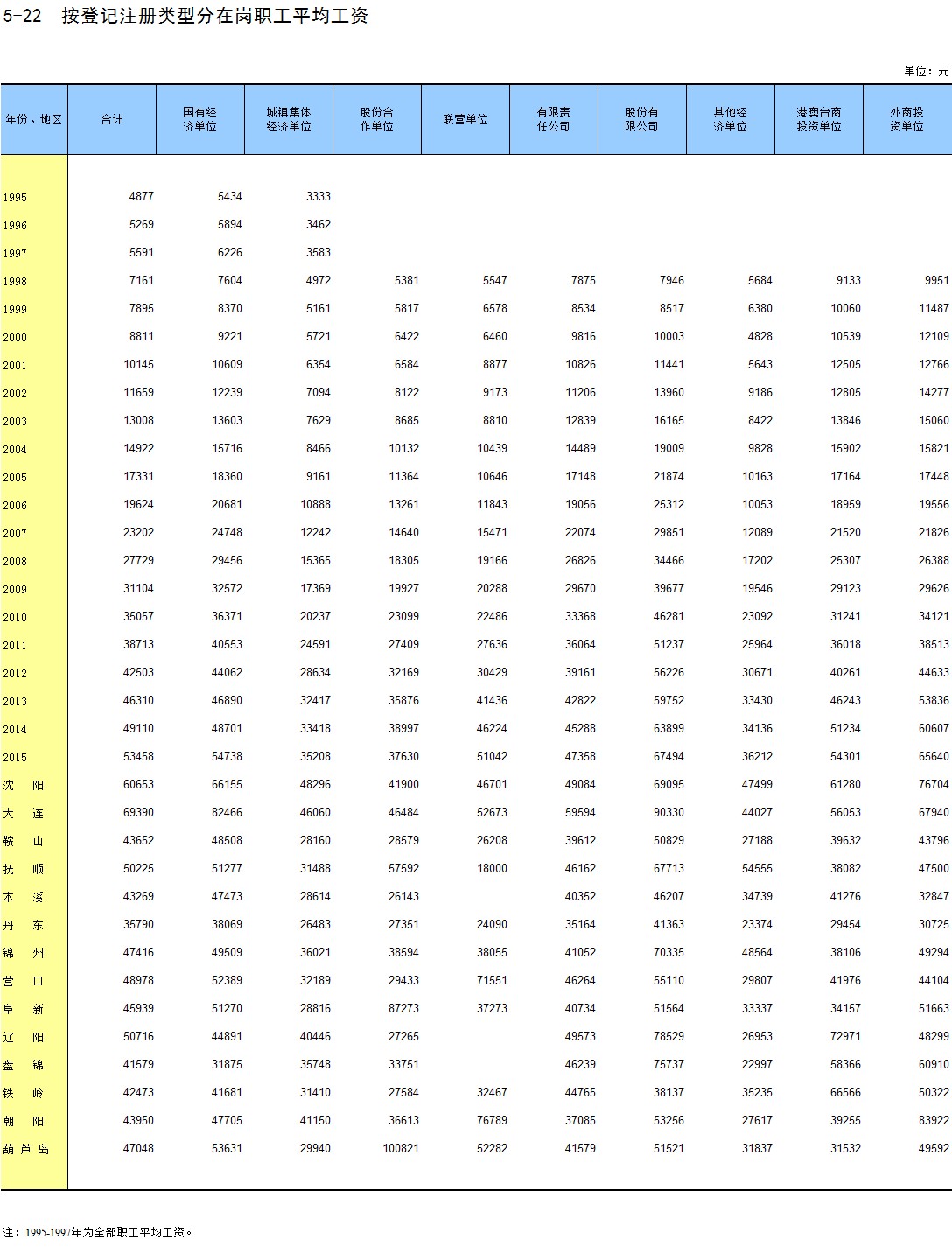 5-22 按登记注册类型分在岗职工平均工资