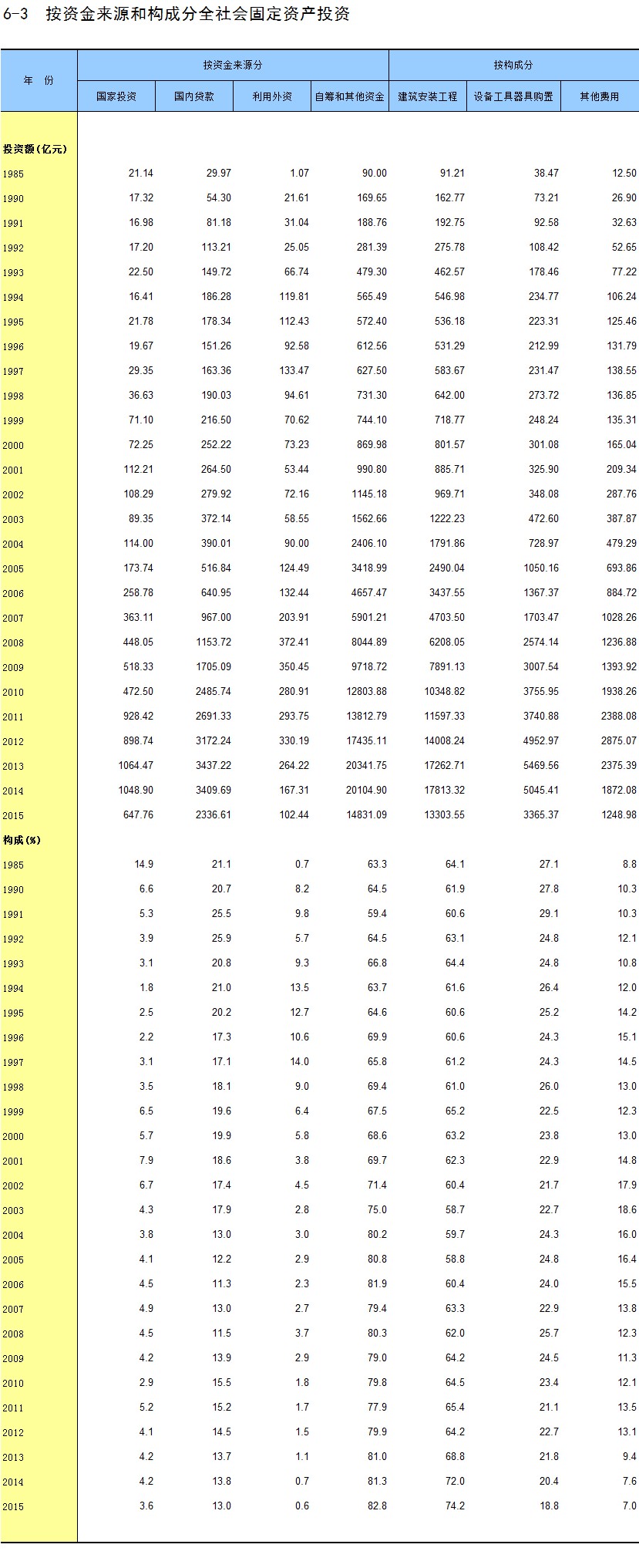 6-3 按资金来源和构成分全社会固定资产投资