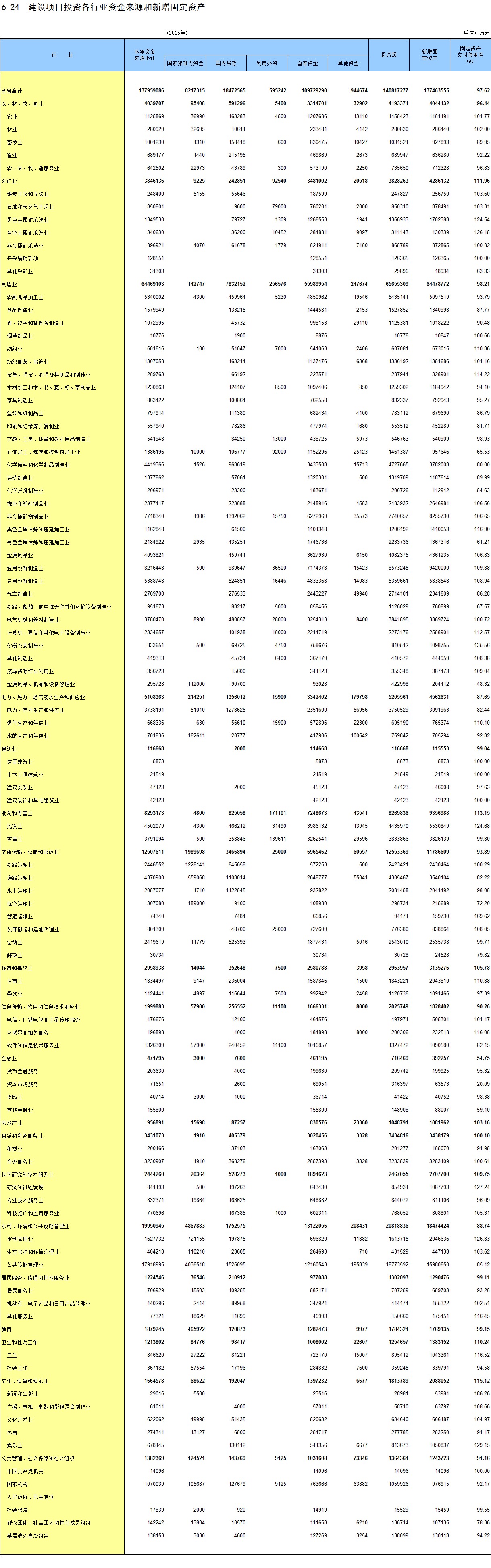 6-24 建设项目投资各行业资金来源和新增固定资产
