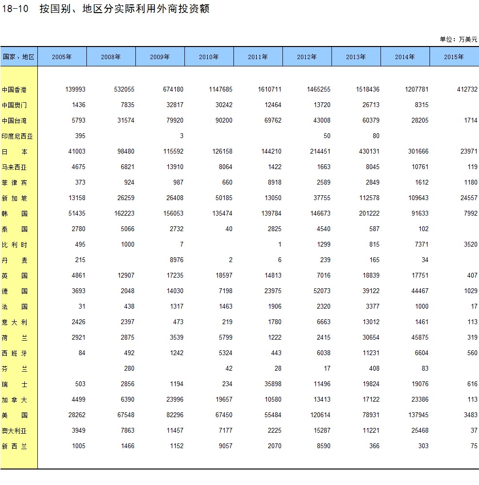 18-10 按国别、地区分实际利用外商投资额