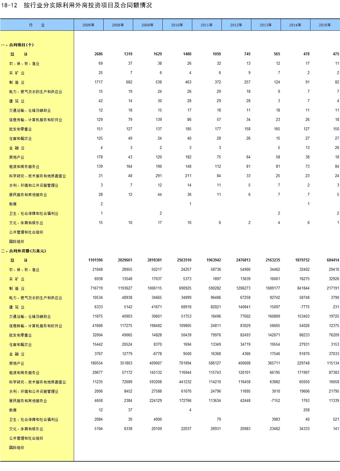 18-12 按行业分实际利用外商投资项目及合同额情况