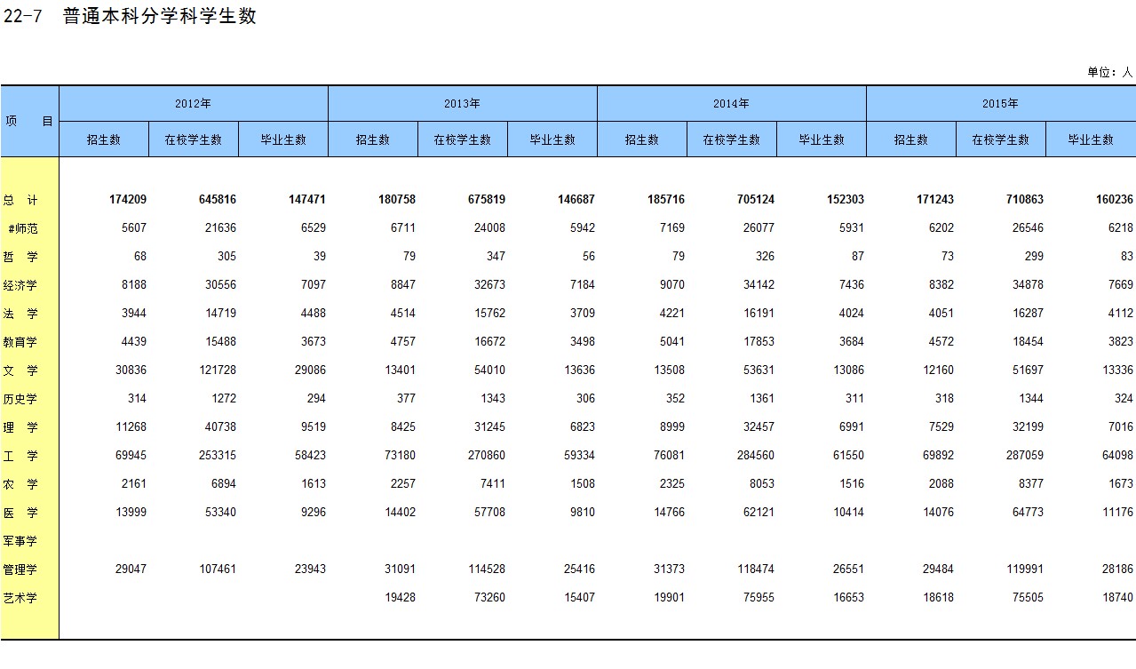 22-7 普通本科分学科学生数