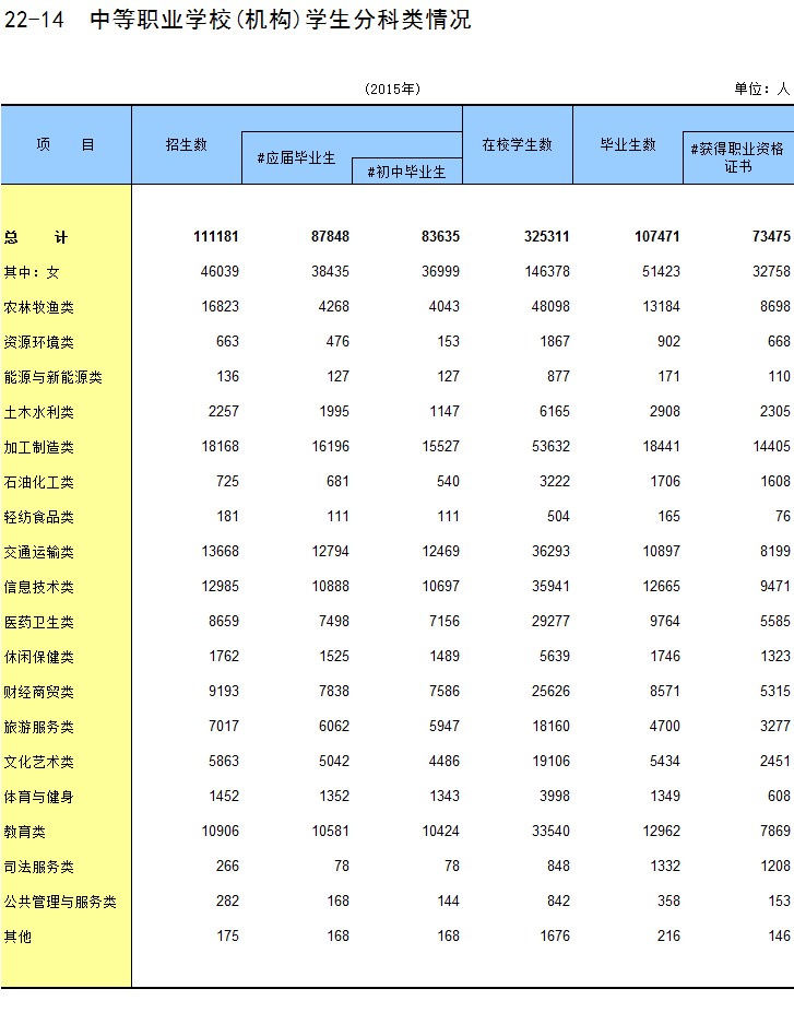 22-14 中等职业学校(机构)学生分科类情况